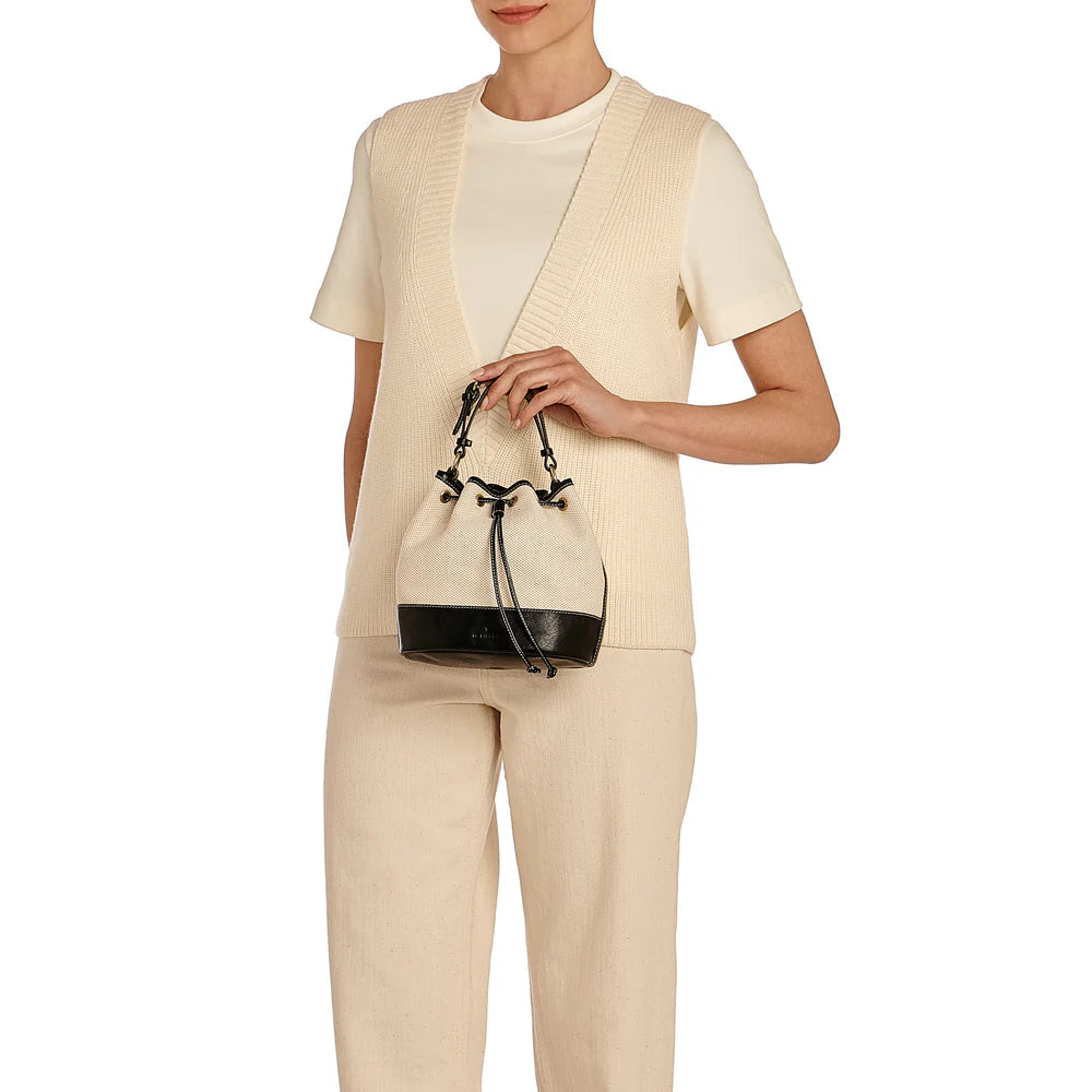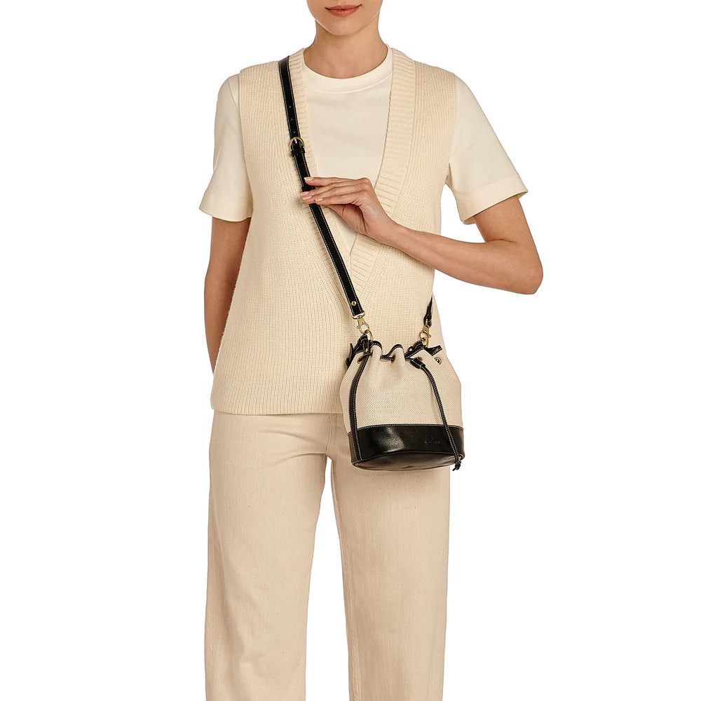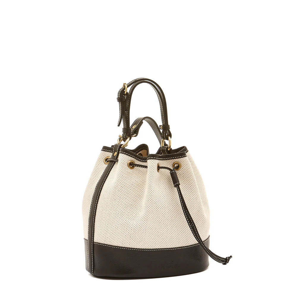 Bucket bag with a drawstring closure that reinterprets a great classic from the Heritage collection. Made of durable organic cotton and linen canvas, its base, trim, drawstring and handle are in vegetable-tanned leather. The shoulder strap can be removed and adjusted with snap hooks. Metal drawstring loops. 100% made in Italy and produced in the province of Florence by master craftsmen in Il Bisonte's 30-Km supply chain.