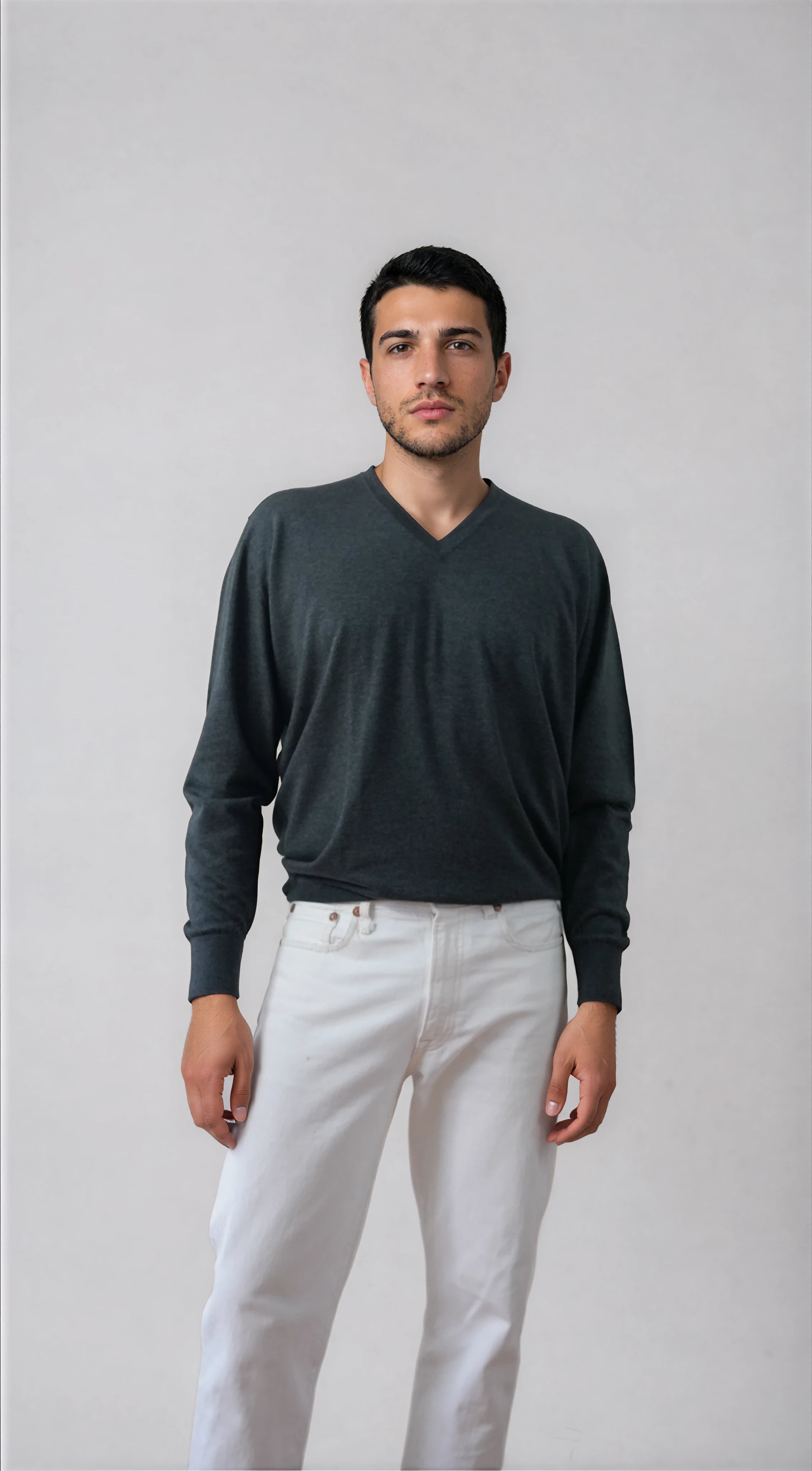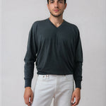 The soft, premium cashmere feels smooth against the skin and holds its shape with a gentle, lived-in drape. Its charcoal hue is versatile and timeless, pairing as effortlessly with tailored trousers as it does with denim or layered over a crisp shirt. The classic V-neckline and clean lines keep the look polished without feeling overly formal, making it one of those pieces you can build countless outfits around.
