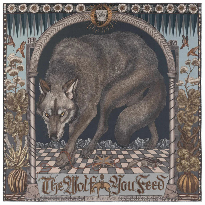 Designed by Sabina Savage, The Wolf You Feed draws inspiration from history, folklore, and humanity’s evolving relationship with the natural world. The central motif references the dioramas of the American Museum of Natural History and reflects on the near-extirpation of the gray wolf in the United States—driven by fear, prejudice, and human intervention.
