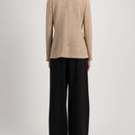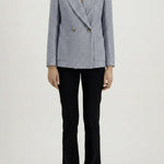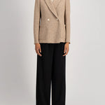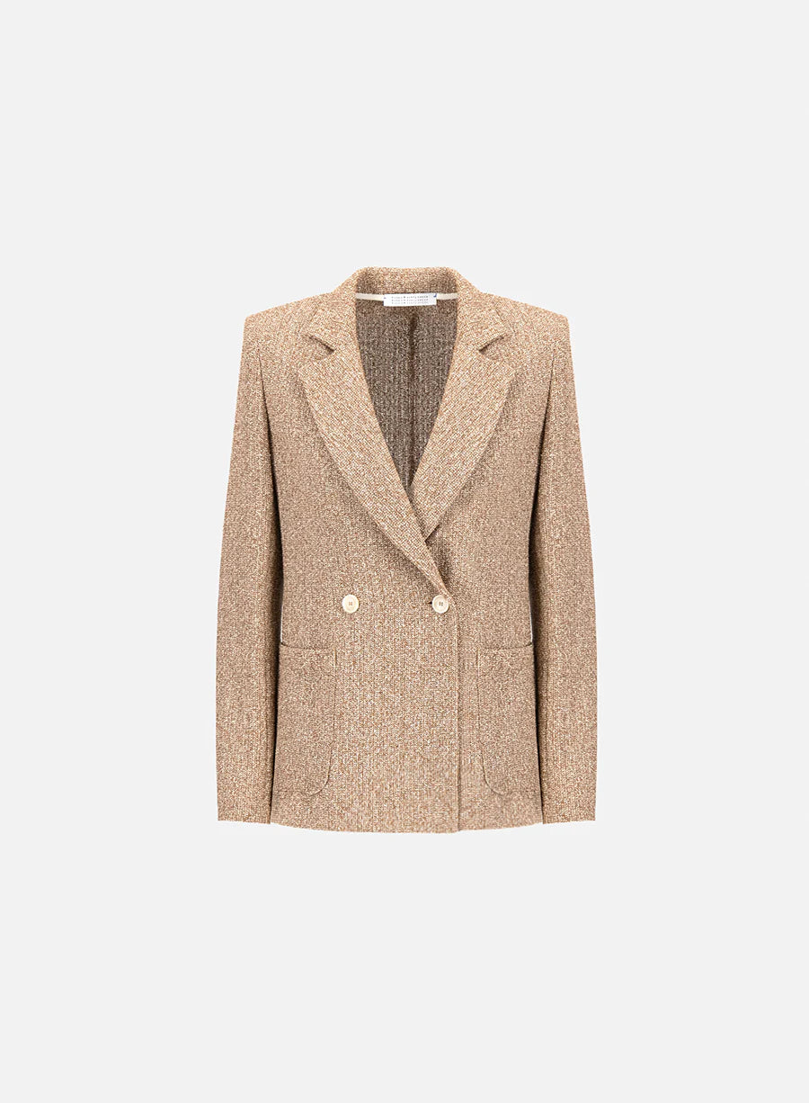 Designed with a double-breasted front and wide lapel, the silhouette remains timeless while feeling relaxed and easy to wear. Subtle shoulder pads add definition, while the soft knit construction allows for natural movement without the stiffness of traditional tailoring.
