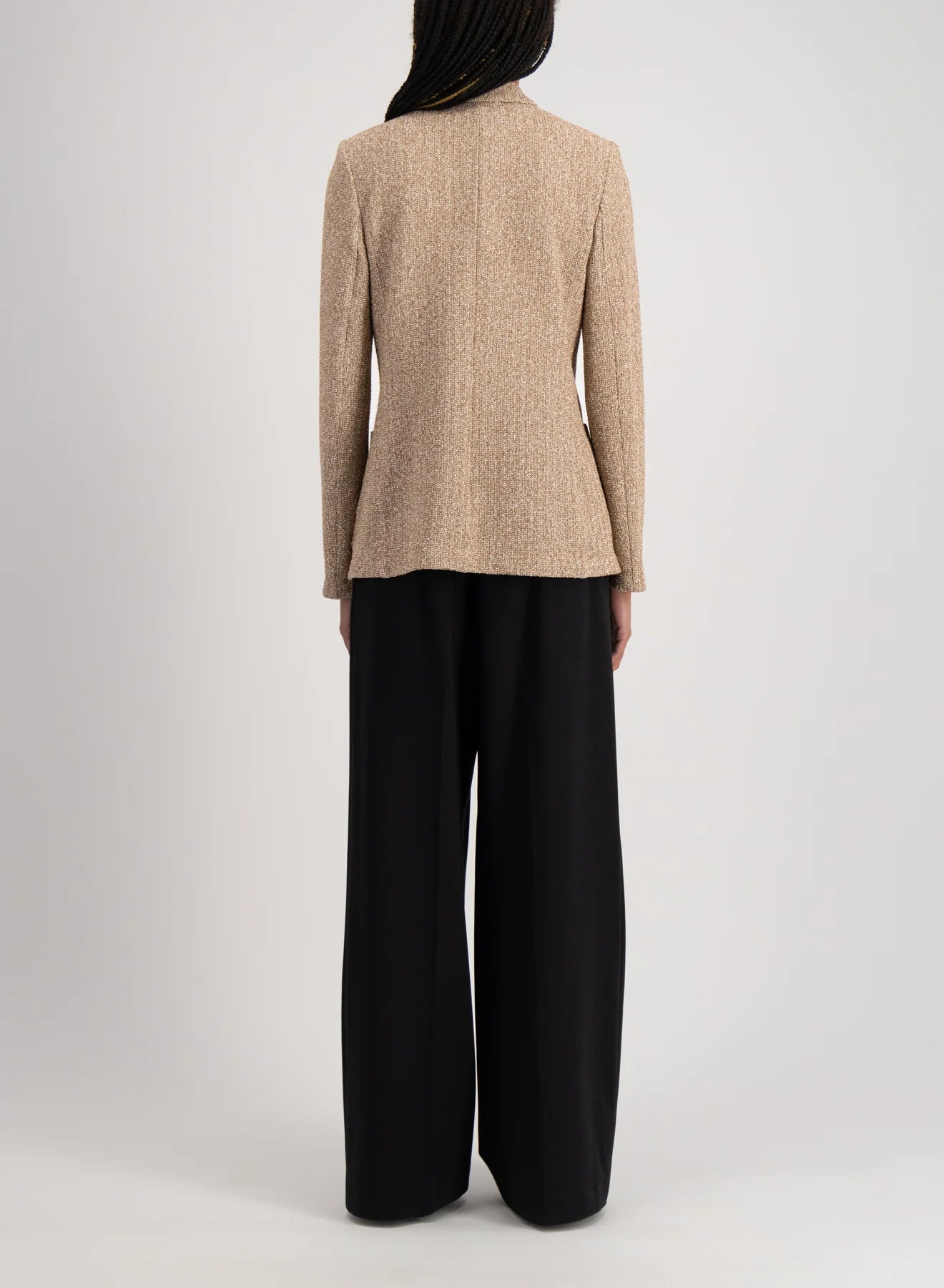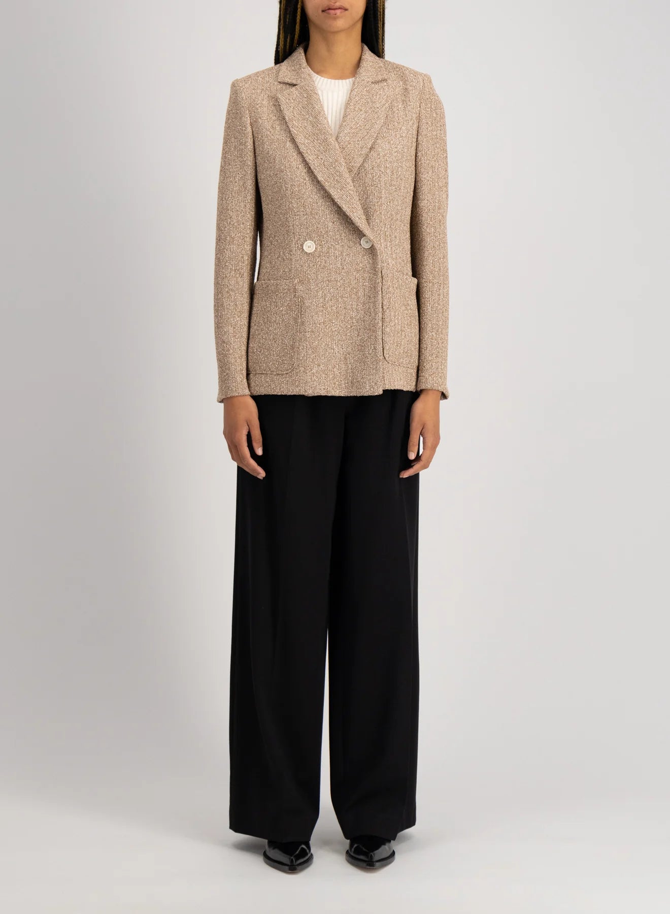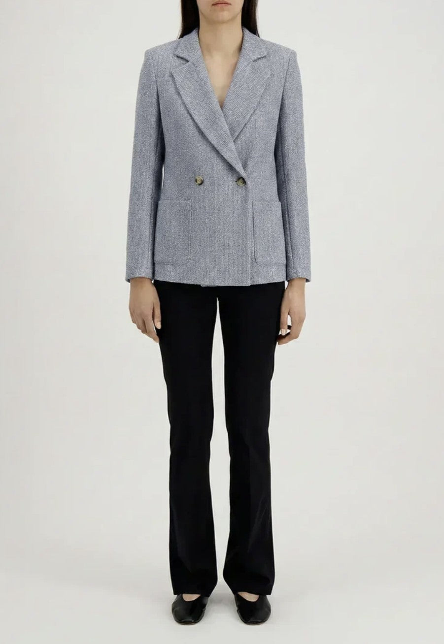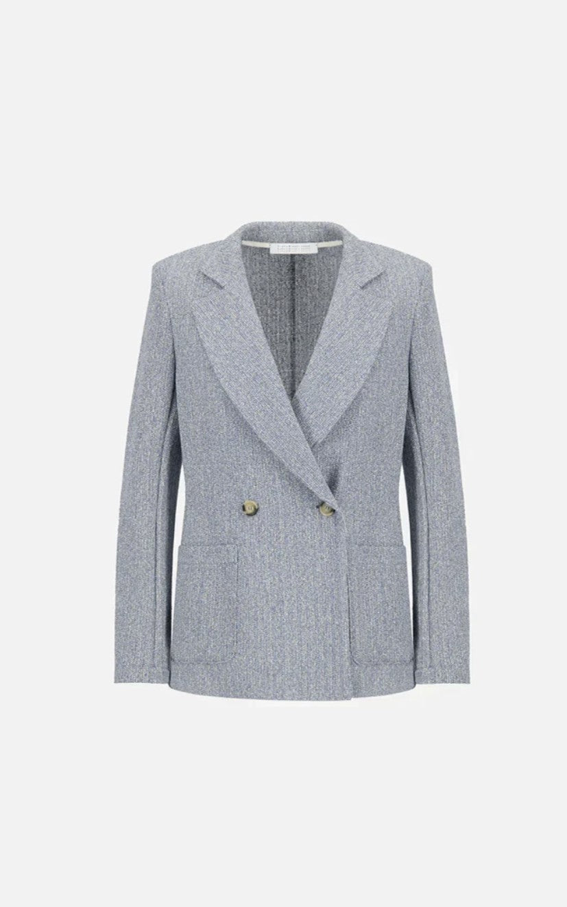 The Double Breasted Knit Blazer by Harris Wharf London offers a refined interpretation of modern tailoring. Crafted in a bicolour frisé knit, this unlined blazer combines texture, structure, and comfort in a distinctly effortless way.