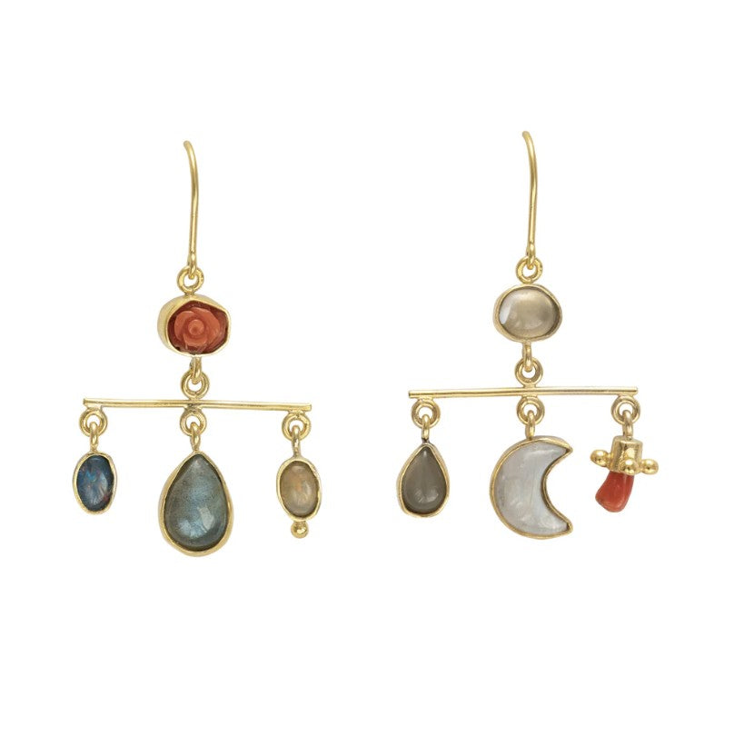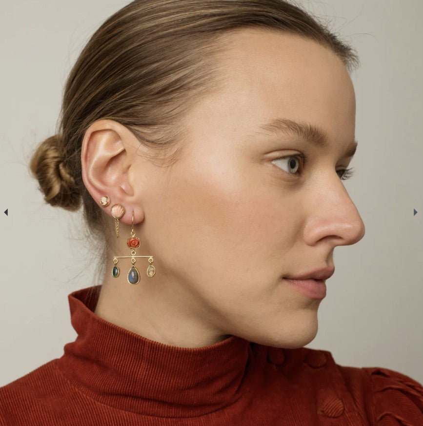 The Balance Drop Earrings by Grainne Morton are a celebration of movement, color, and thoughtful craftsmanship. Designed in Scotland and made using ethically sourced 18k gold-plated silver, each pair brings together coral, labradorite, moonstone, opal, and rainbow moonstone in a beautifully layered composition.