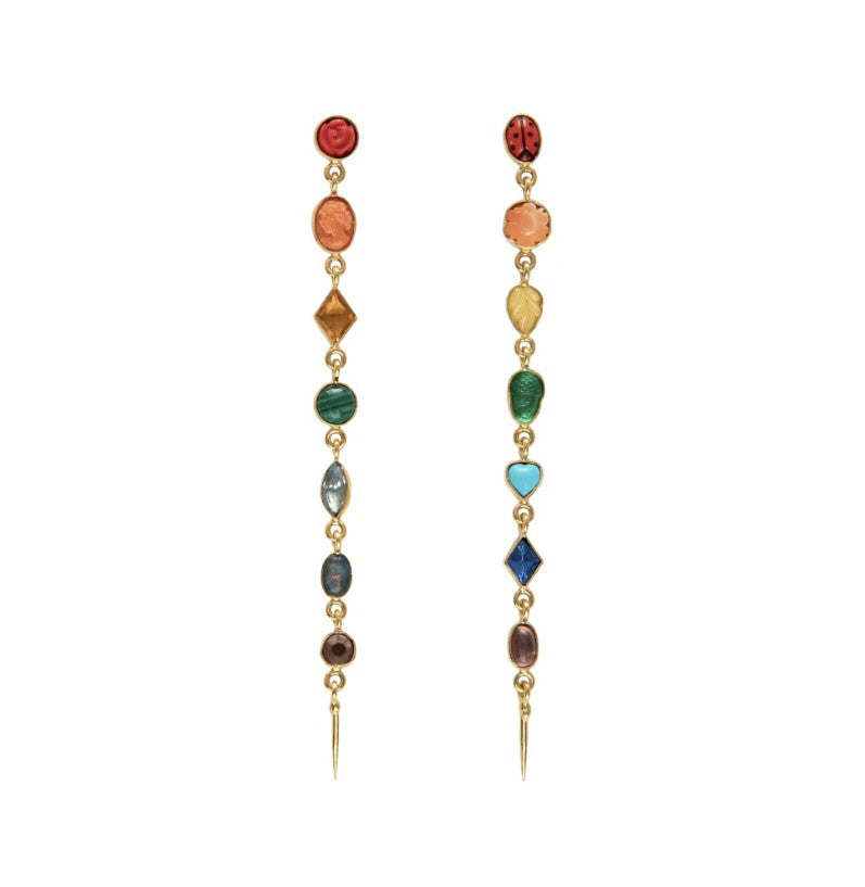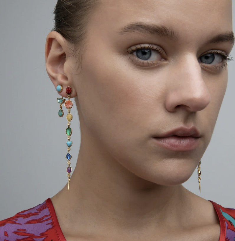 The Long Rainbow Drop Earrings by Grainne Morton are a striking expression of color, movement, and artistic craftsmanship. Designed in Scotland and made using ethically sourced 18k gold-plated silver, this elongated silhouette features a rich mix of coral, malachite, opal, sapphire, turquoise, vintage rhinestone, and glass.