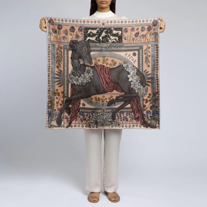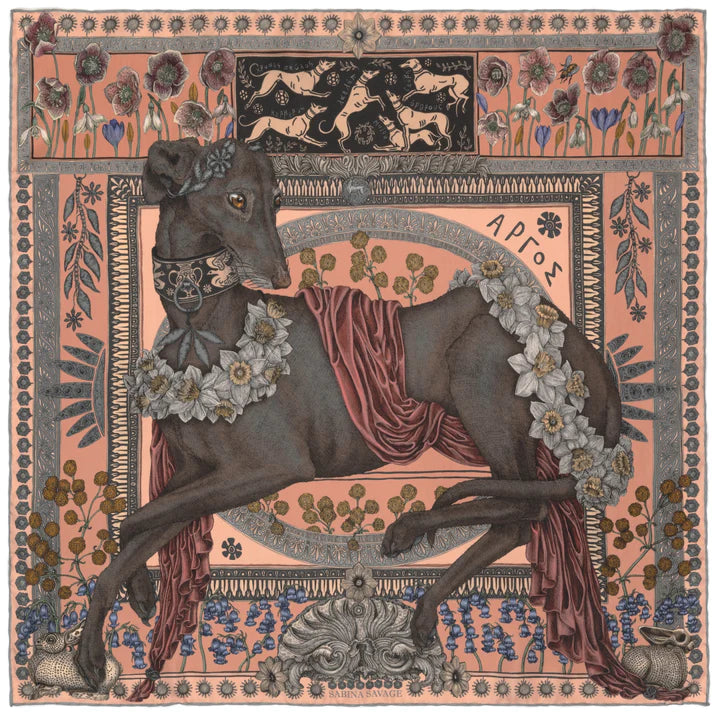This design is based around ancient Greek art, pottery, poetry and literature. It features an elegant protagonist, representing Argos, the faithful and tragic dog of Odysseus in the Homeric epic, The Odyssey. The dog reclines in the centre of the design, draped in a swathed himation, wreaths of narcissi and a crown of beaten silver. Around his neck sits a terracotta collar, painted in the style of ancient Greek pottery vessels. Above the dog’s head appears a detailed terracotta plaque, detailing other famous dogs of Greek myth and legend. Surrounding the central image are borders featuring patterns and designs inspired by the vase painters of ancient Greece, who also inspired the composition of this design. Odysseus’ garden of Ithaca is invoked by the floral details within the design; from bluebells and snowdrops to hellebore and giant Fennel, these faunae were all revered by the Greek gods. At the base of the design sit a pair of terracotta rabbit vases, and a central terracotta flourish. The outer borders represent metal and alabaster plaques inspired by the Minoan Aegina Treasure.