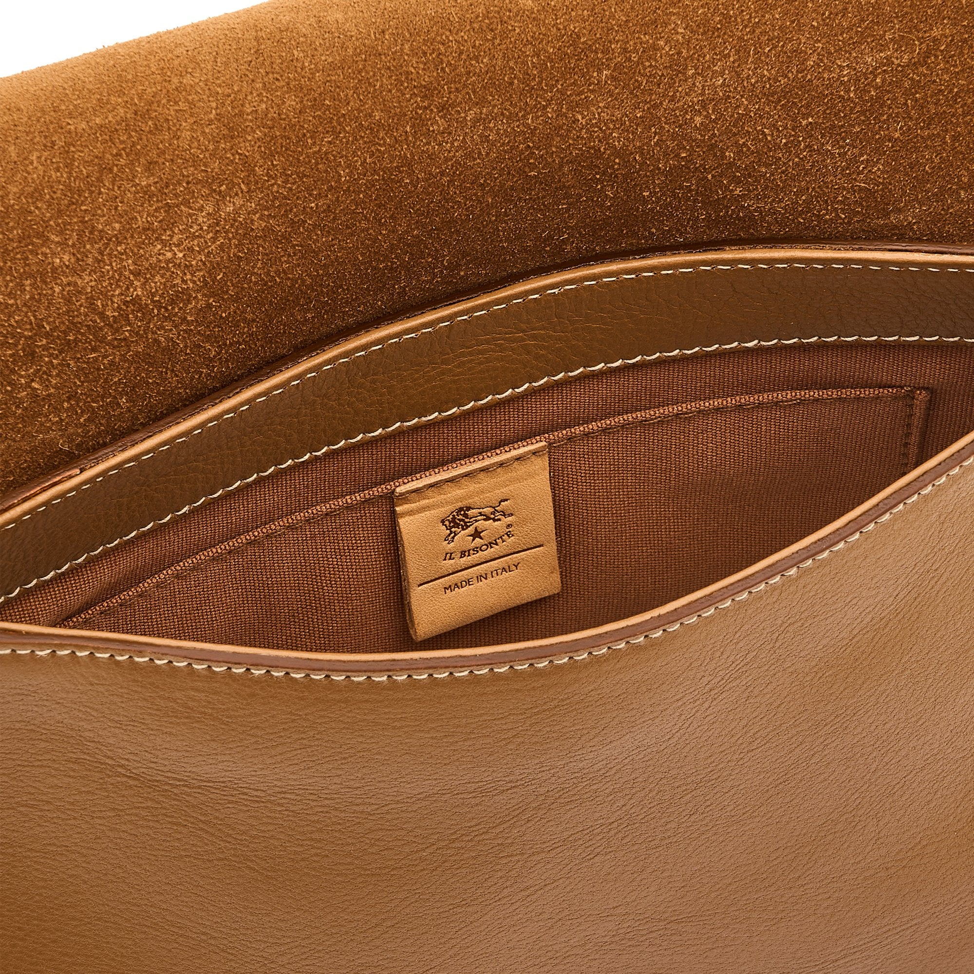 Front view of the Il Bisonte Archivo Saddle Bag in Gianduia, handmade in Tuscany from vegetable-tanned Italian leather with loop closure.
