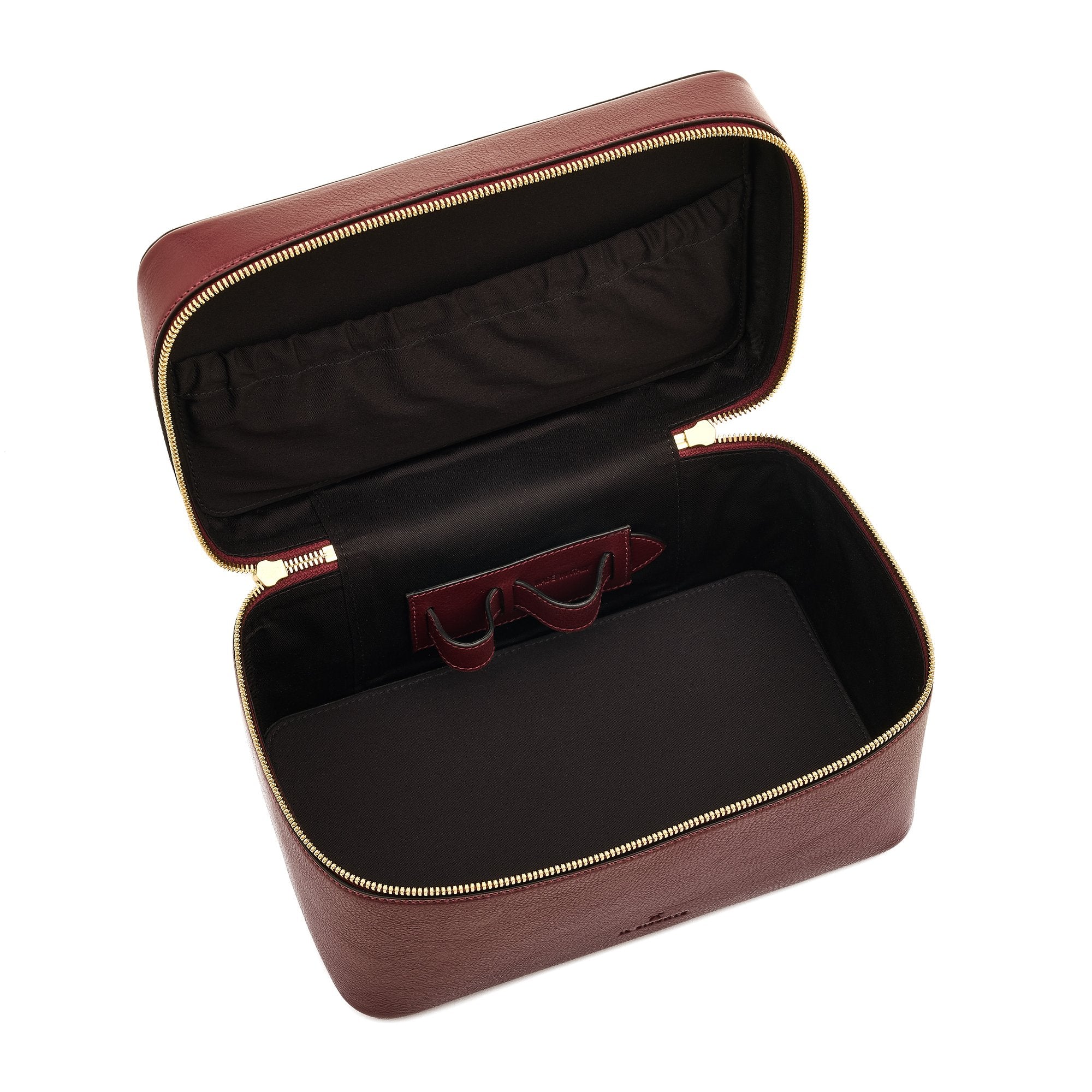 Front view of the Il Bisonte Musa Travel Case in Black Cherry, handmade in Tuscany from vegetable-tanned cowhide leather with a double-slider zip and waterproof lining.