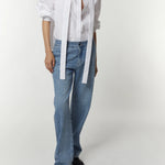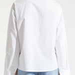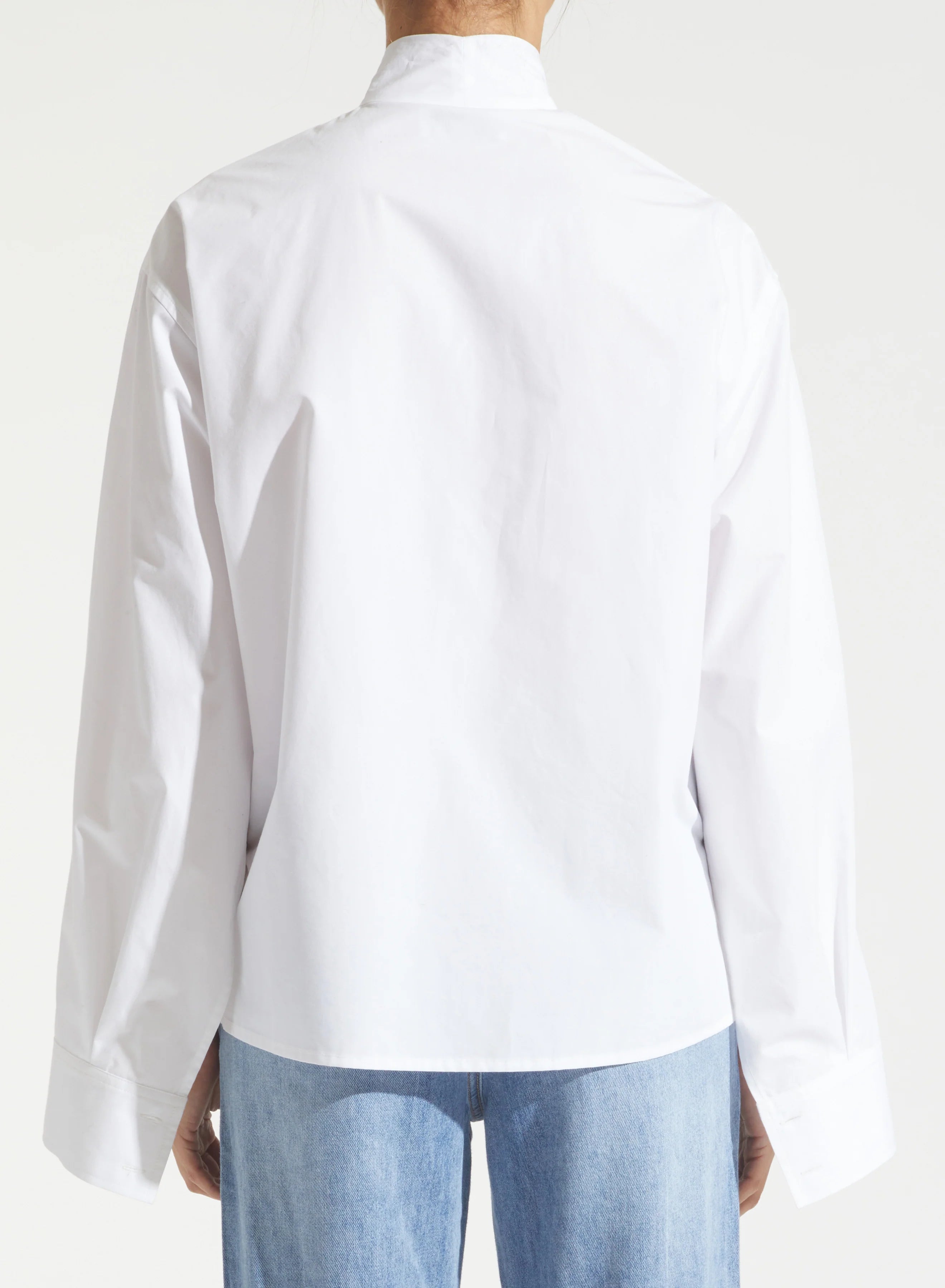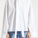 Elevate your wardrobe with our white poplin button-down with tie at neck and wide sleeves, and embrace the perfect balance between classic charm and contemporary style. Upgrade your fashion game with this must-have piece that effortlessly transitions from day to night.
