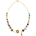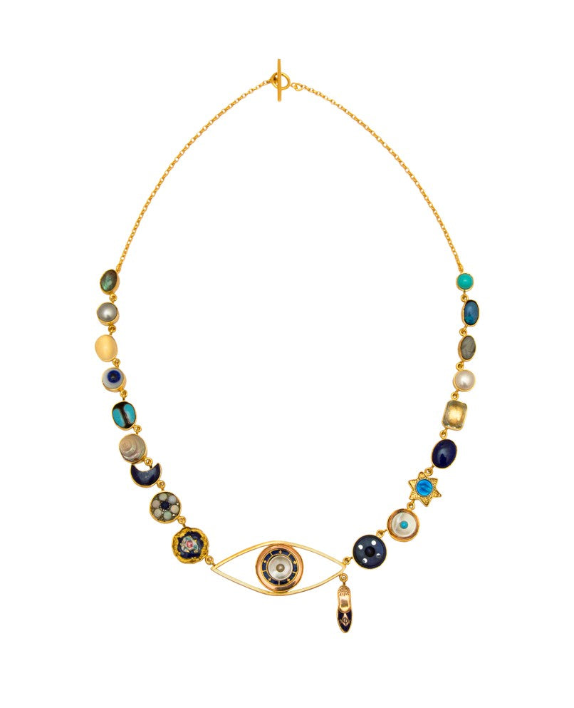 Handcrafted in Edinburgh, this one-of-a-kind piece brings together a captivating mix of antique and natural materials. Featuring an antique button, enamel detailing, labradorite, lapis, moonstone, opal, pearl, turquoise, vintage glass, and shell—all set on an ethically sourced 18k gold-plated silver chain.