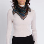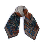 This style is a medium-weight, beautifully soft wool and silk blend fabric. Its matte, opaque texture gives the prints an antique finish, and each piece is finished with a masterful hand-rolled edging. Our 65 x 65cm scarves are the perfect size for everyday wear.