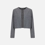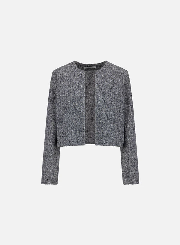 Collarless jacket, unlined in knitted bicolour frisé.Short jacket with shoulder pads and boxy shape, featuring a round neckline and no closure.Clean finish.Made in Italy with Italian fabric.